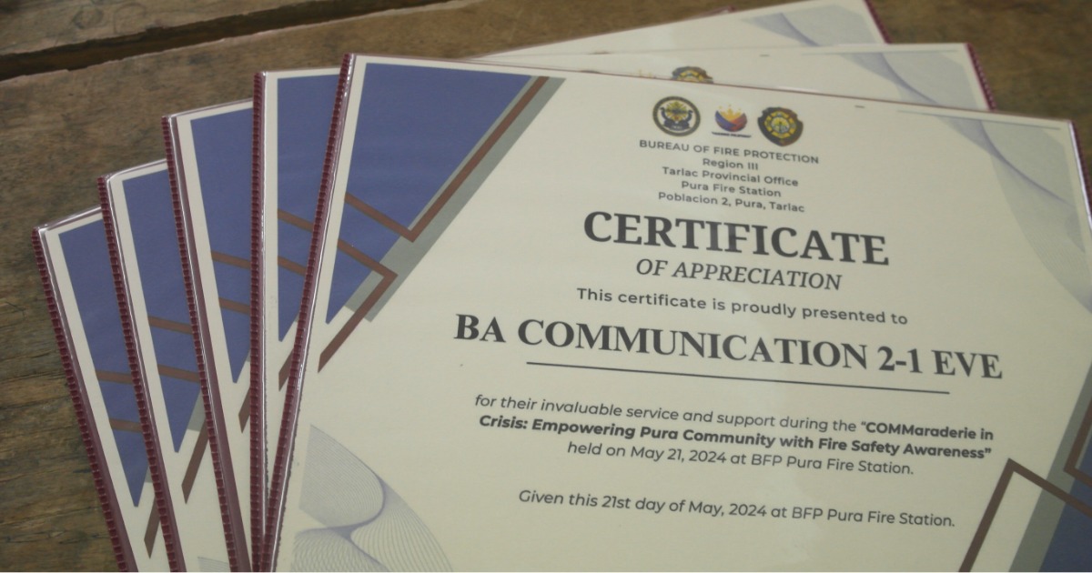 BackBA Communication 2-1 EVE students organized a fire safety awareness initiative titled “Commaraderie in Crisis: Empowering Pura Community with Fire Safety Awareness” on May 21,2024. The activity was conducted in collaboration with the Bureau of Fire Protection (BFP) in Pura, Tarlac, as part of their course in Risk, Disaster, and Humanitarian Communication.