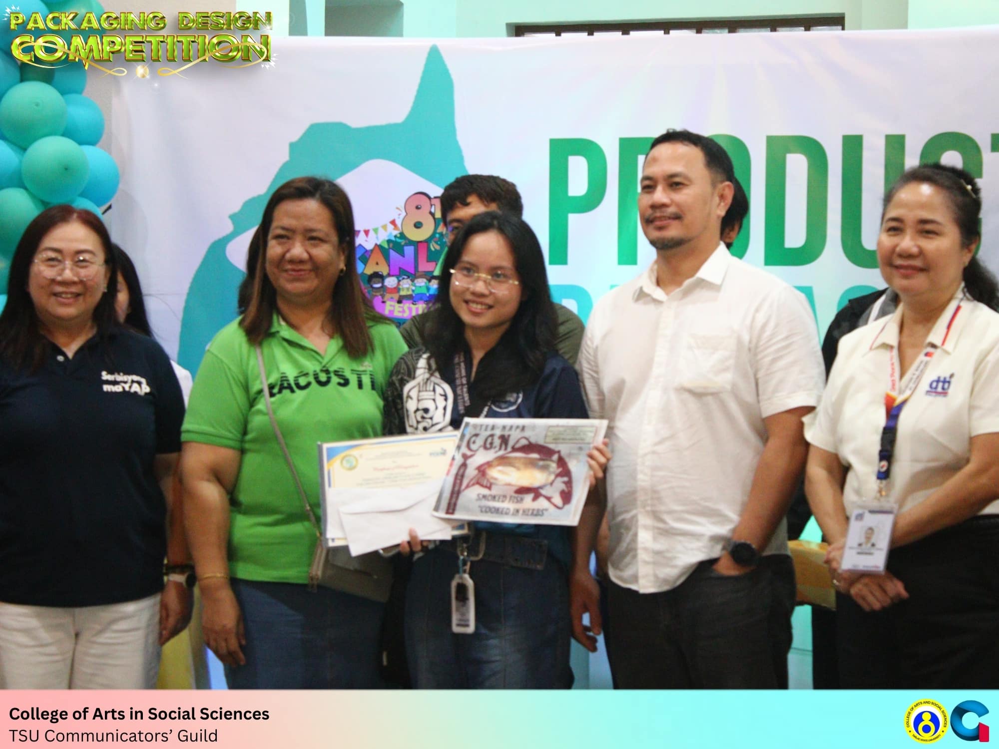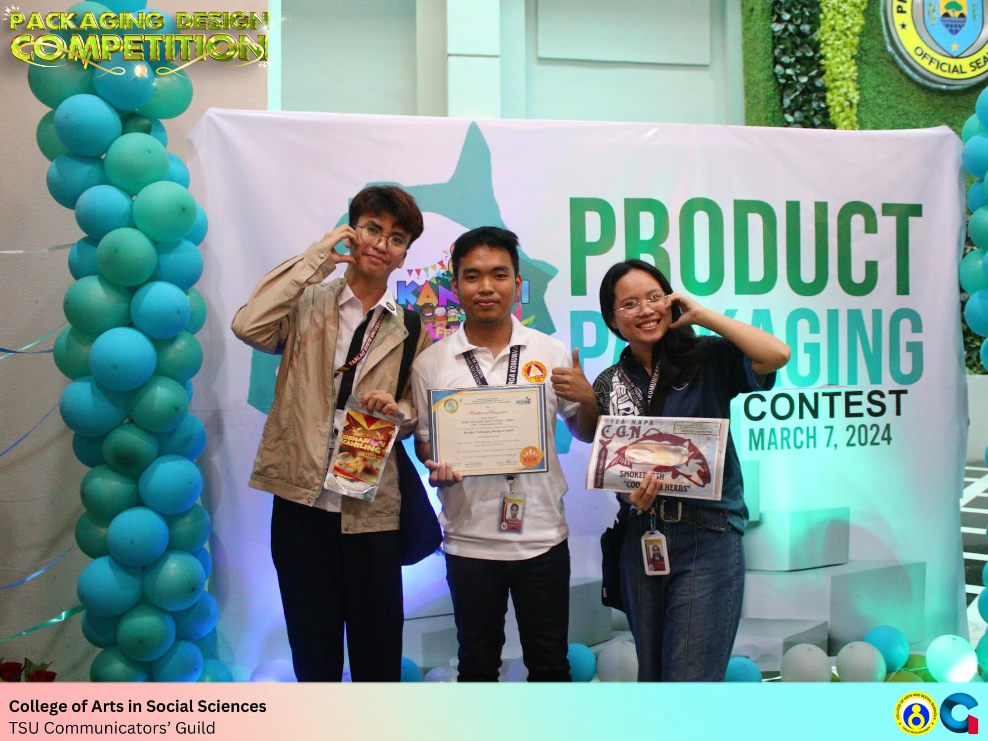 Representing the Department of Communication, Mr. Jefferson Maliwat and Ms. Thimothy Addelaide Yvonne Perez of the TSU Communicators’ Guild designed the product packaging for TEA-napa by CGN Food Product Company and Chicharon Camiling. Although their entries did not advance to the final round, Ms. Perez received the CGN Food Products’ Choice Award for her outstanding design concept.